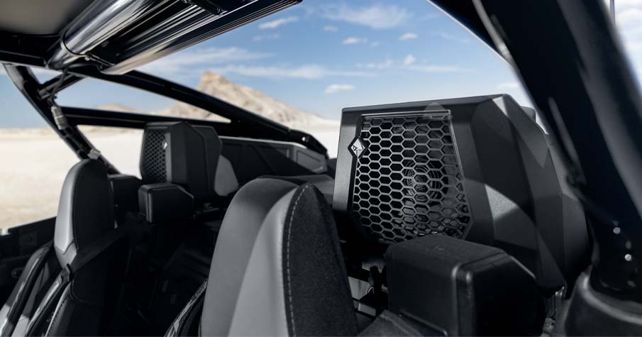 - Sistema de áudio Rockford Fosgate Stage 4, ajustado de fábrica e integrado, com unidade de origem RIDE COMMAND. Inclui (1) amplificador digital de 8 canais e 1500 W, (2) tweeters de 1" e 100 W, (2) colunas frontais de componente de 6,5" e 100 W, (2) colunas traseiras coaxiais de 6,5" e 100 W, e (1) subwoofer de 10". *O Sistema de Áudio foi testado para imersão em água, com classificações IPX7 e IPX9K, para resistir a condições húmidas.